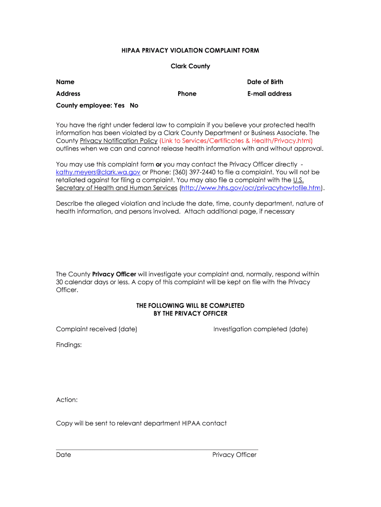 Get the free HIPAA PRIVACY VIOLATION COMPLAINT FORM Clark County ... - clark wa