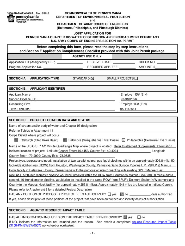3150PMBWEW0036ARev. 8/2016COMMONWEALTH OF PENNSYLVANIA DEPARTMENT OF ENVIRONMENTAL PROTECTION and DEPARTMENT OF ARMY CORPS OF ENGINEERS (Baltimore, Philadelphia, and Pittsburgh Districts)JOINT APPLICATION