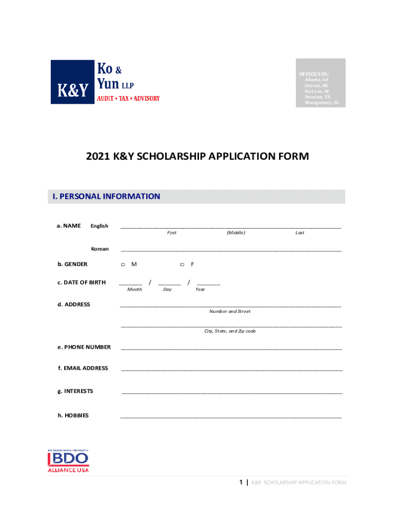 OFFICES IN: Atlanta, GA Detroit, MI Fort Lee, NJ Houston, TX Montgomery, AL2021 K&Y SCHOLARSHIP APPLICATION FORM. I.PERSONAL INFORMATION. NAME English___ FirstKoreanLast___b. Gender. DATE OF BIRTH___MMonthd.