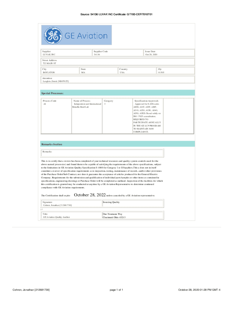 Source: 54136 LAVA INC Certificate: GT193CERT010701SupplierSupplier Reissue DateLUVAK INC54136Oct 28, 2020Street Address 722 MAIN STCityStateCountryZipBOYLSTONMAUSA01505Attention: Languors, Derek