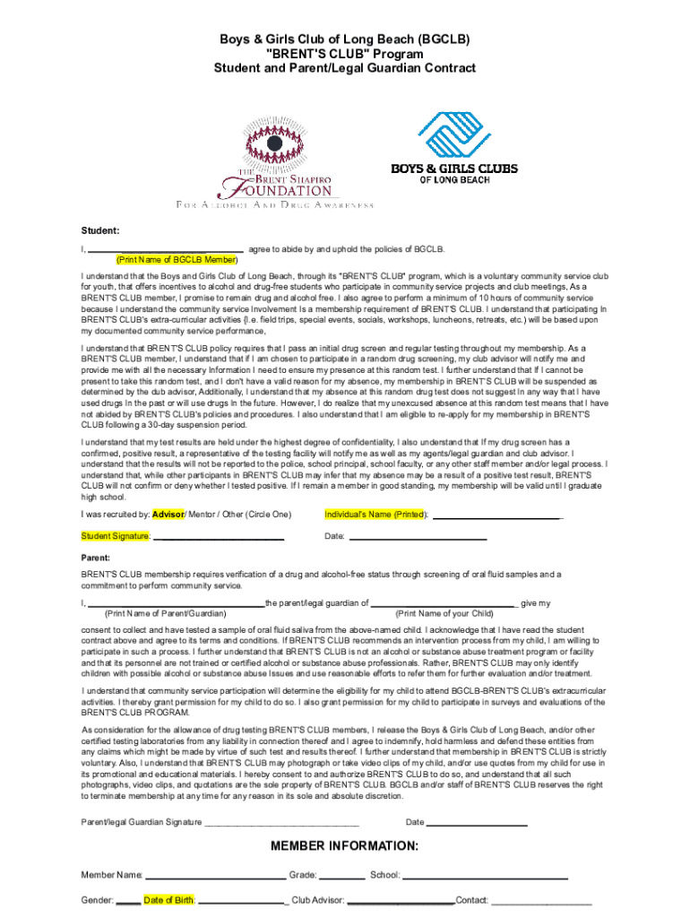 Boys & Girls Club of Long Beach (BULB) \” BRENT\'S CLUB\” Program Student and Parent/Legal Guardian ContractStudent: I, ___ (Print Name of BULB Member)agree to abide by and uphold the policies