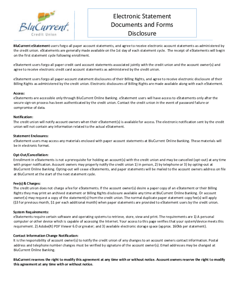 Electronic Statement Documents and Forms Disclosure Current statement users forgo all paper account statements, and agree to receive electronic account statements as administered by the credit union.