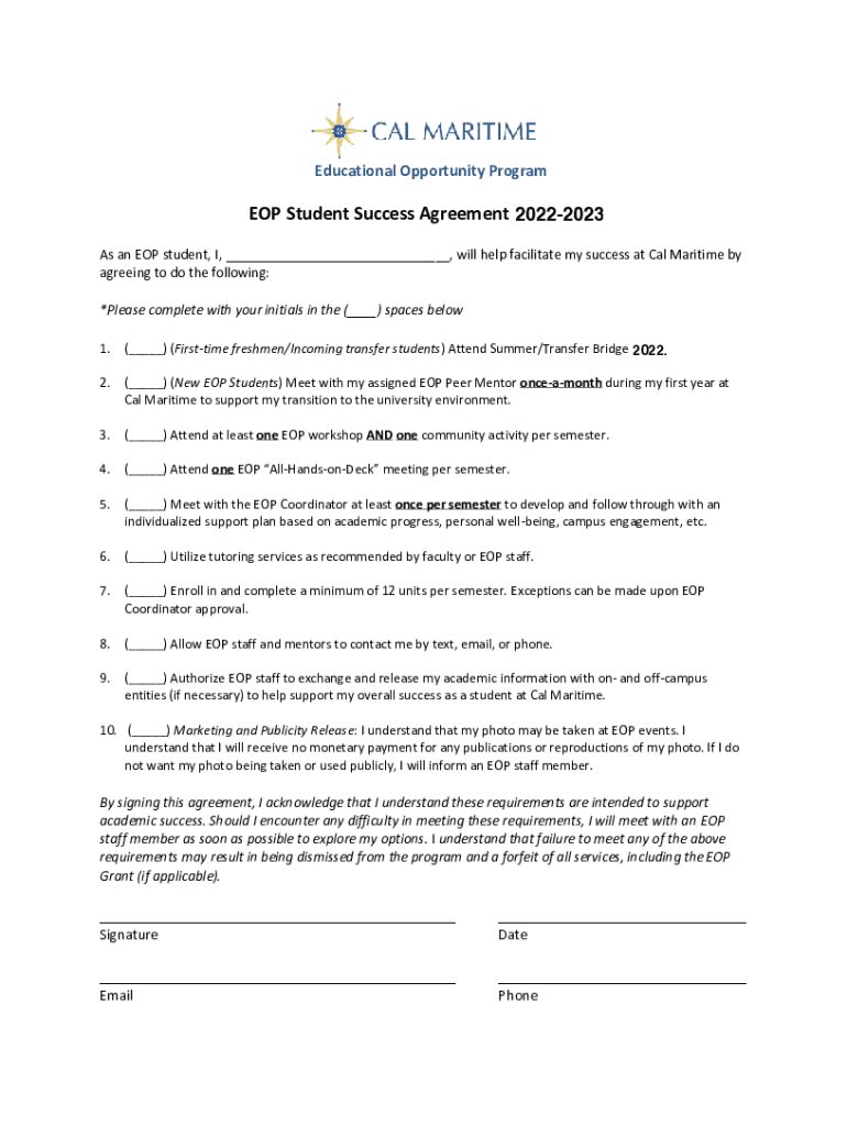 Educational Opportunity Program Student Success Agreement 20202021 20222023 As an TOP student, I, ___, will help facilitate my success at Cal Maritime by agreeing to do the following: *Please complete