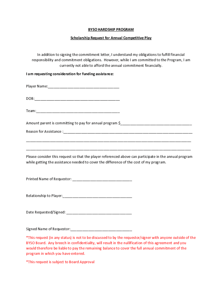 BSO HARDSHIP PROGRAM Scholarship Request for Annual Competitive Playing addition to signing the commitment letter, I understand my obligations to fulfill financial responsibility and commitment obligations.
