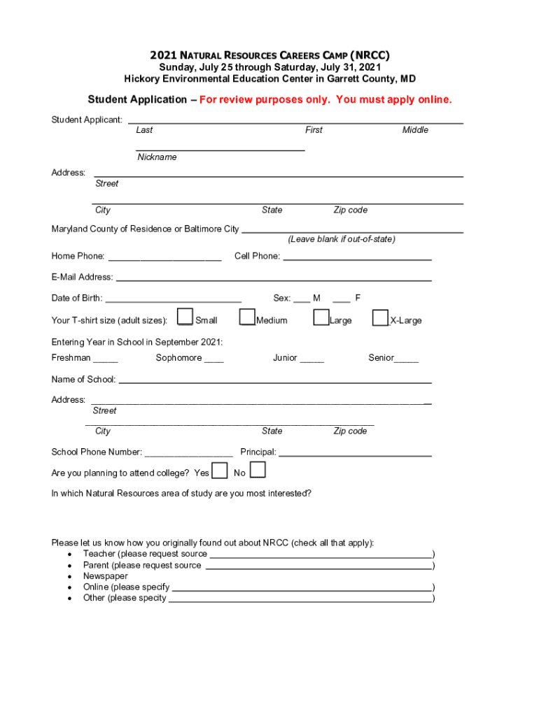 2021 NATURAL RESOURCES CAREERS CAMP (NRC) Sunday, July 25 through Saturday, July 31, 2021, Hickory Environmental Education Center in Garrett County, Student Application For review purposes only. You