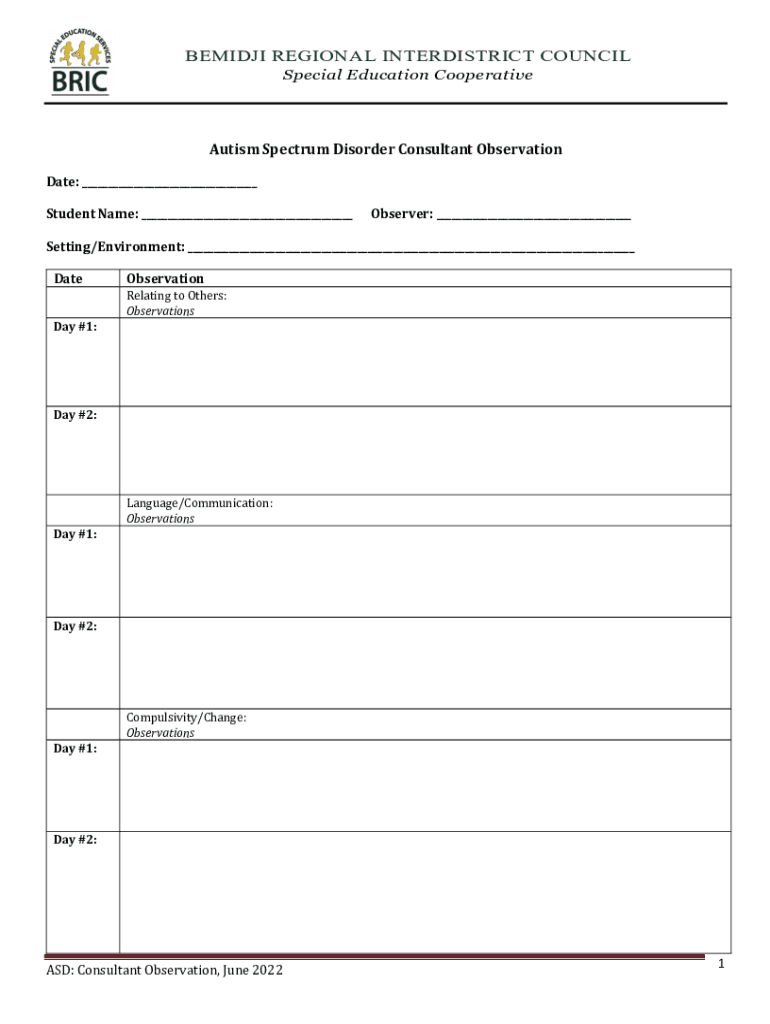 BESIDE REGIONAL INTERDISTRICT COUNCIL Special Education CooperativeAutism Spectrum Disorder Consultant Observational: ___Student Name: ___Observer: ___Setting/Environment: ___DateObservationDay #1:Relating