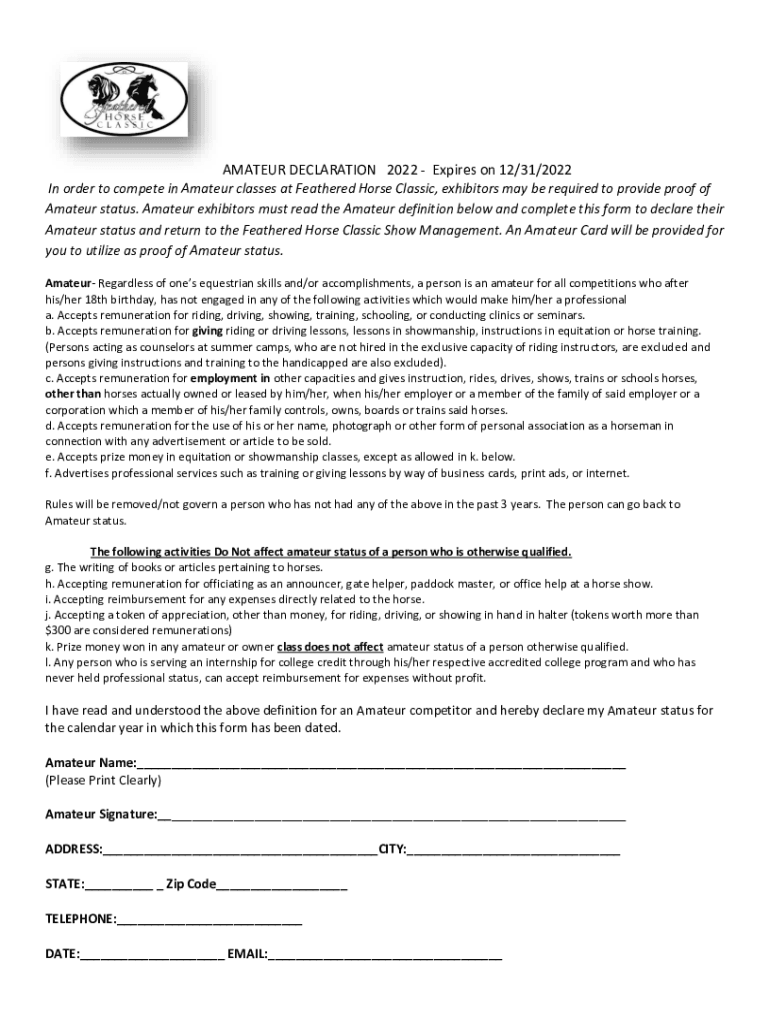 AMATEUR DECLARATION 2022 Expires on 12/31/2022 In order to compete in Amateur classes at Feathered Horse Classic, exhibitors may be required to provide proof of Amateur status. Amateur exhibitors