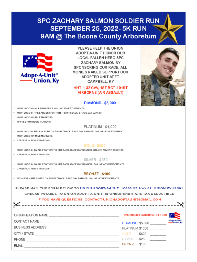 SPC ZACHARY SALMON SOLDIER RUN SEPTEMBER 25, 2022 5K RUN 9AM @ The Boone County Arboretum PLEASE HELP THE UNION ADOPTAUNIT HONOR OUR LOCAL FALLEN HERO SPC ZACHARY SALMON BY SPONSORING OUR RACE. ALL