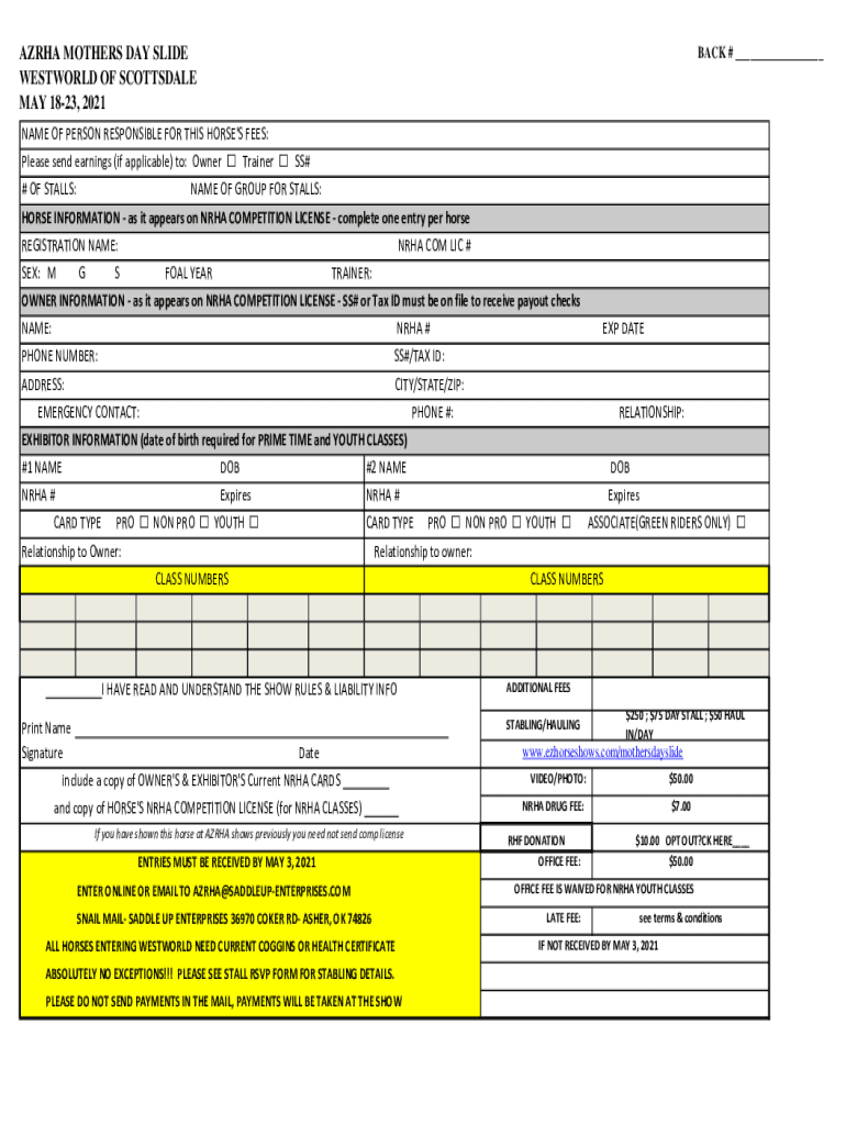AREA MOTHERS Day SLIDE WESTWARD OF SCOTTSDALE MAY 1823, 2021BACK # ___NAME OF PERSON RESPONSIBLE FOR THIS HORSE\'S FEES: Please send earnings (if applicable) to: Owner Trainer SS# # OF STALLS:NAME