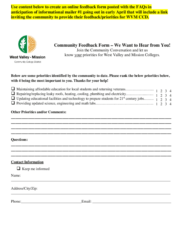 Use content below to create an online feedback form posted with the FAQs in anticipation of informational mailer #1 going out in early April that will include a link inviting the community to provide