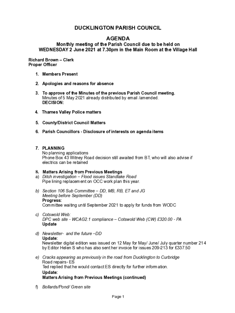 BURLINGTON PARISH COUNCIL AGENDA Monthly meeting of the Parish Council due to be held on WEDNESDAY 2 June 2021 at 7.30pm in the Main Room at the Village Hall Richard Brown Clerk Proper Officer 1.