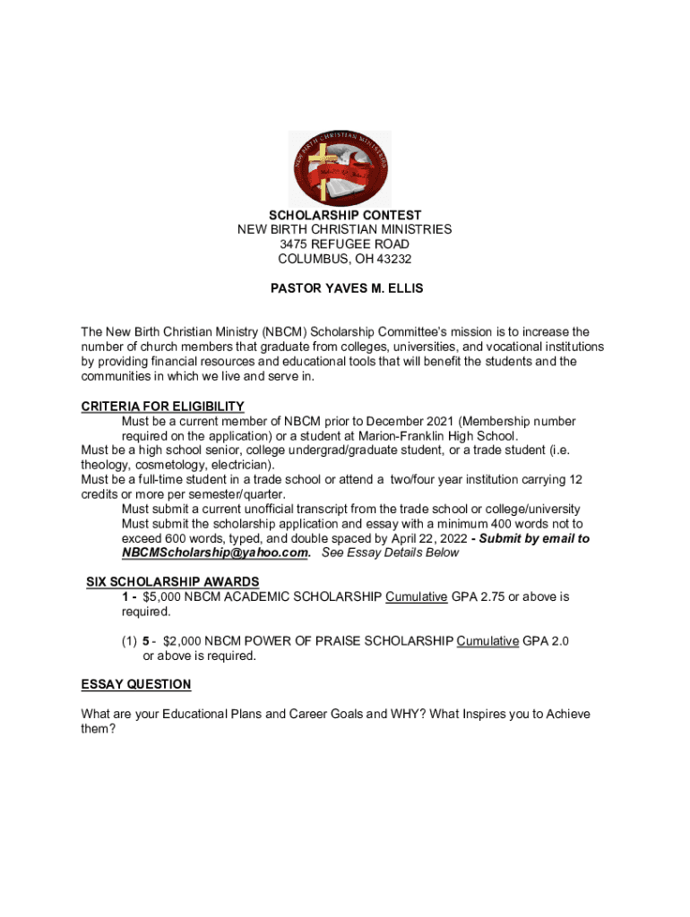 SCHOLARSHIP CONTEST NEW BIRTH CHRISTIAN MINISTRIES 3475 REFUGEE ROAD COLUMBUS, OH 43232 PASTOR WAVES M. ELLIS The New Birth Christian Ministry (NBC) Scholarship Committees mission is to increase the