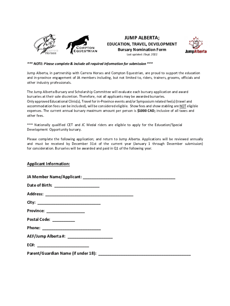 JUMP ALBERTA;EDUCATION, TRAVEL, DEVELOPMENT Bursary Nomination Form Last updated: Sept. 2022*** NOTE: Please complete & include all required information for submission *** Jump Alberta, in partnership