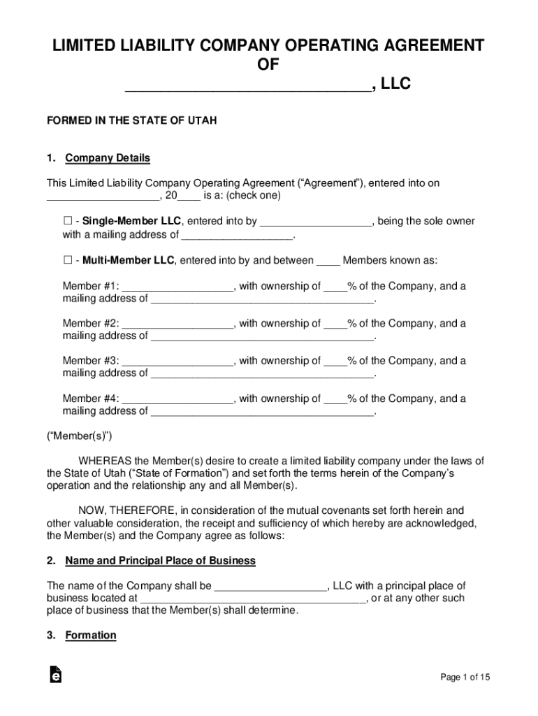 LIMITED LIABILITY COMPANY OPERATING AGREEMENT OF ___, LLC FORMED IN THE STATE OF UTAH 1. Company Details This Limited Liability Company Operating Agreement (Agreement), entered into on ___, 20___