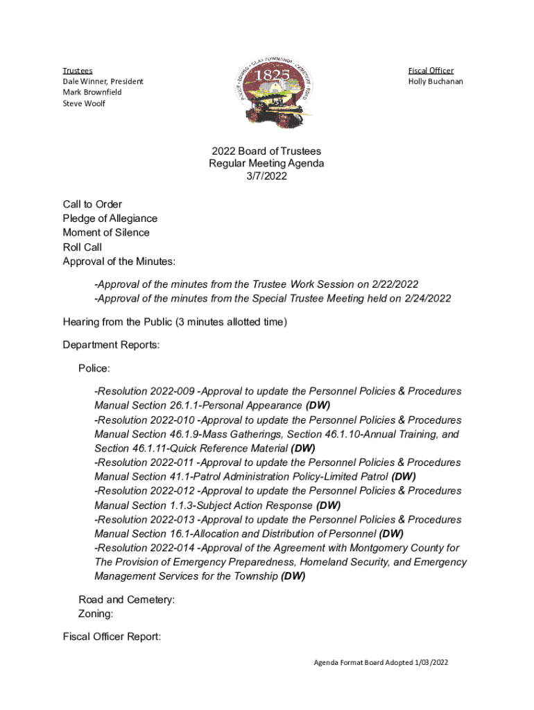 Trustees Dale Winner, President Mark Brownfield Steve WoolfFiscal Officer Holly Buchanan2022 Board of Trustees Regular Meeting Agenda 3/7/2022 Call to Order Pledge of Allegiance Moment of Silence