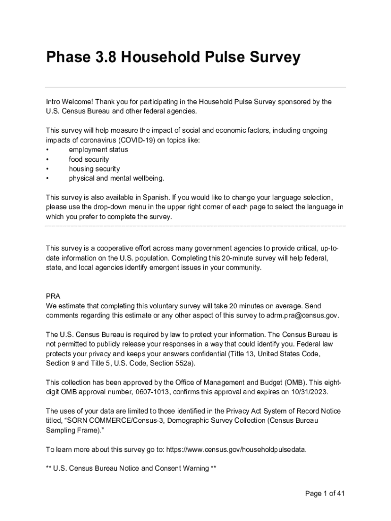 Phase 3.8 Household Pulse Survey Intro Welcome! Thank you for participating in the Household Pulse Survey sponsored by the U.S. Census Bureau and other federal agencies. This survey will help measure
