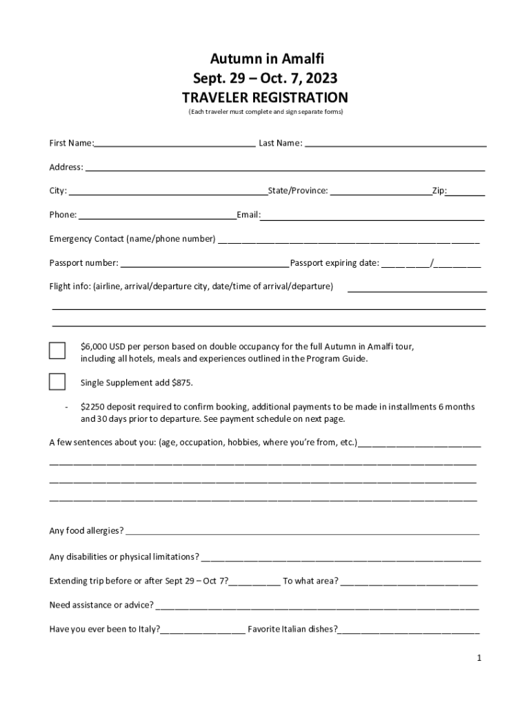 Autumn in Amalfi Sept. 29 Oct. 7, 2023 TRAVELER REGISTRATION (Each traveler must complete and sign separate forms)First Name:Last Name:Address: City:State/Province:Phone:Zip:Email:Emergency Contact