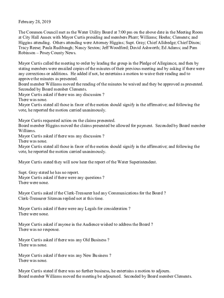 February 28, 2019, The Common Council met as the Water Utility Board at 7:00 pm on the above date in the Meeting Room at City Hall Annex with Mayor Curtis presiding and members Parr; Williams; John;