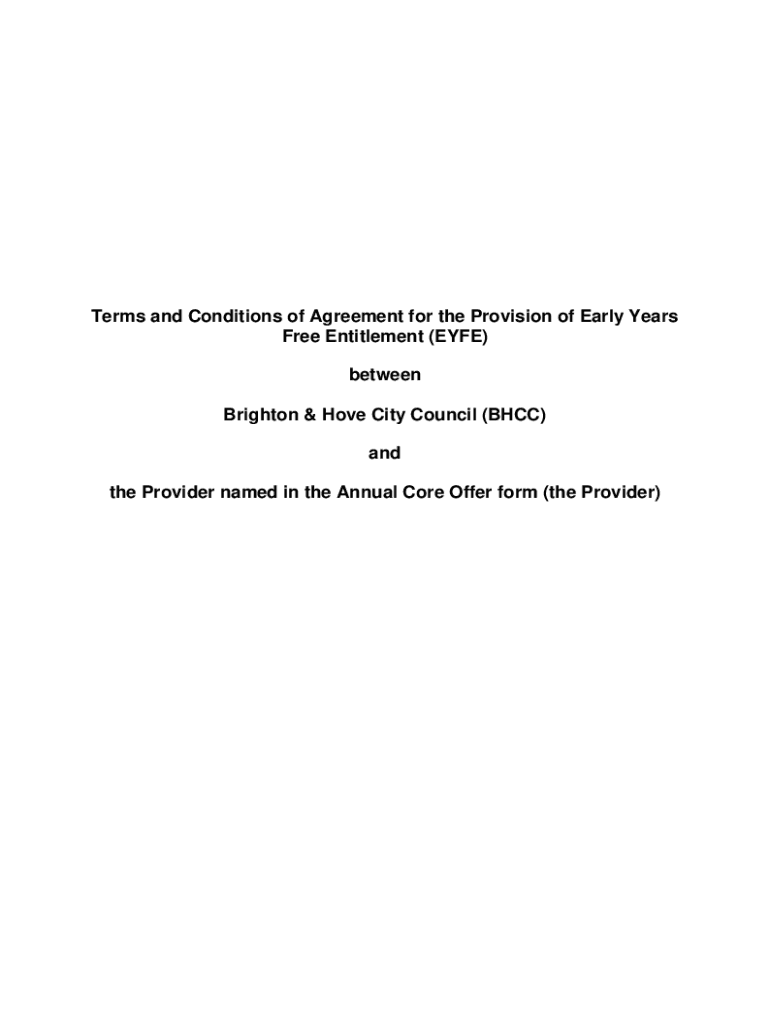 Terms and Conditions of Agreement for the Provision of Early Years Free Entitlement (EYE) between Brighton & Hove City Council (HCC) and the Provider named in the Annual Core Offer form (the Provider)Terms