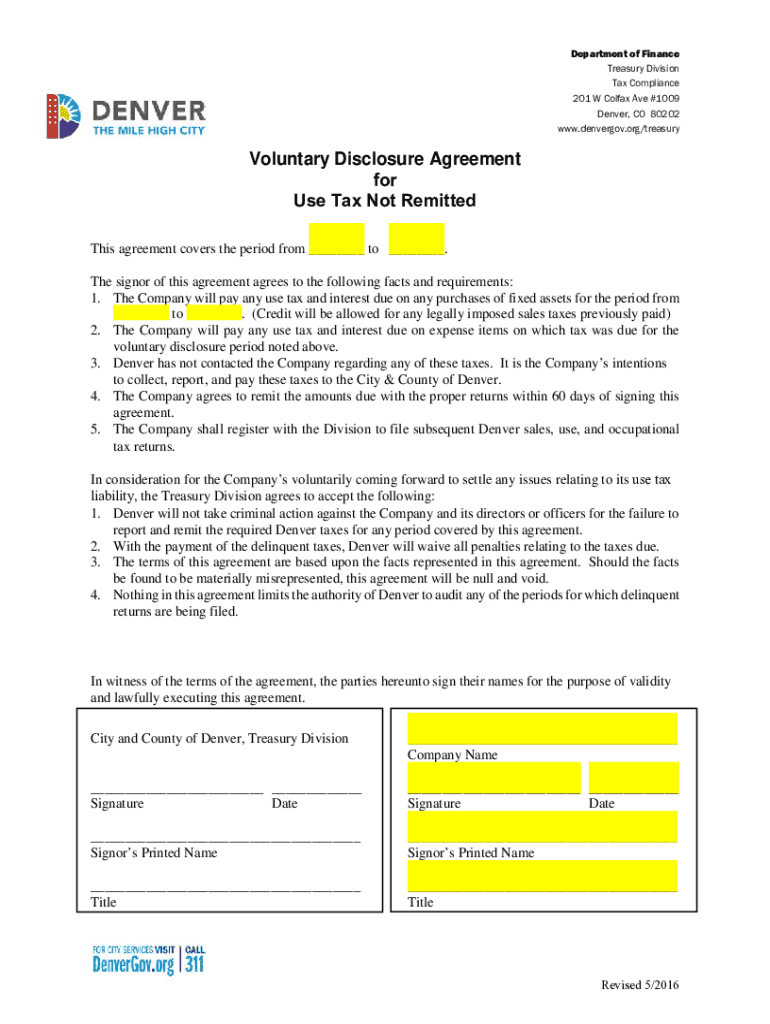 Department of Finance Treasury Division Tax Compliance 201 W Colfax Ave #1009 Denver, CO 80202 www.denvergov.org/treasuryVoluntary Disclosure Agreement for Use Tax Not Remitted This agreement covers