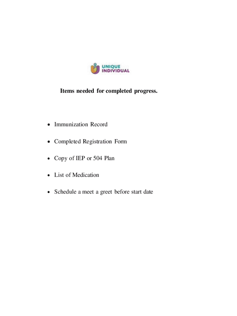 Items needed for completed progress. Immunization Record Completed Registration Form Copy of IEP or 504 Plan List of Medication Schedule a meet a Greek before start atelier Through Play 20232024 Participation