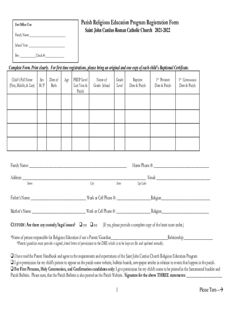 Parish Religious Education Program Registration Former Office Saint John Antics Roman Catholic Church 20212022Family Name:___