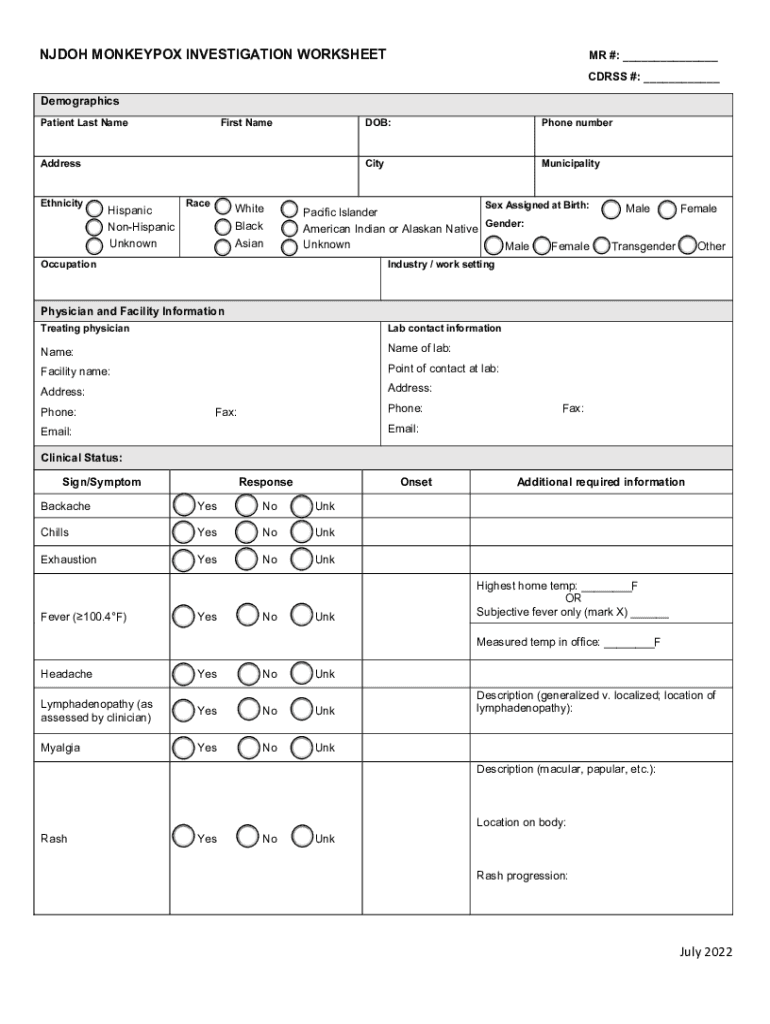 NJ DOH MONEYBOX INVESTIGATION WORKSHEET MR #: ___ CD RSS #: ___Demographics Patient Last NameFirst Headdress Ethnicity Hispanic NonHispanic UnknownRaceWhite Black Asian DOB:Phone numberCityMunicipalitySex