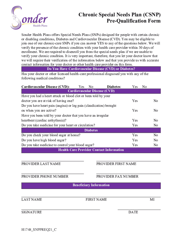 Chronic Special Needs Plan (SNP) PreQualification Form Wonder Health Plans offers Special Needs Plans (SNPs) designed for people with certain chronic or disabling conditions, Diabetes and Cardiovascular