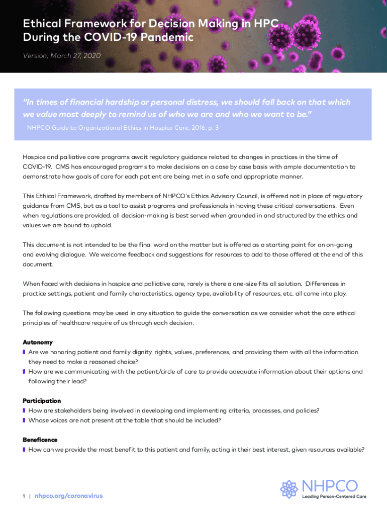 Ethical Framework for Decision Making in HPC During the COVID-19 Pandemic Version, March 27, 2020In times of financial hardship or personal distress, we should fall back on that which we value most