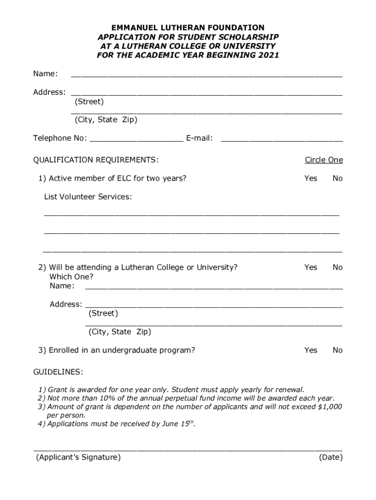 EMMANUEL LUTHERAN FOUNDATION APPLICATION FOR STUDENT SCHOLARSHIP AT A LUTHERAN COLLEGE OR UNIVERSITY FOR THE ACADEMIC YEAR BEGINNING 2021 Name:___Address: ___ (Street) ___ (City, State Zip) Telephone