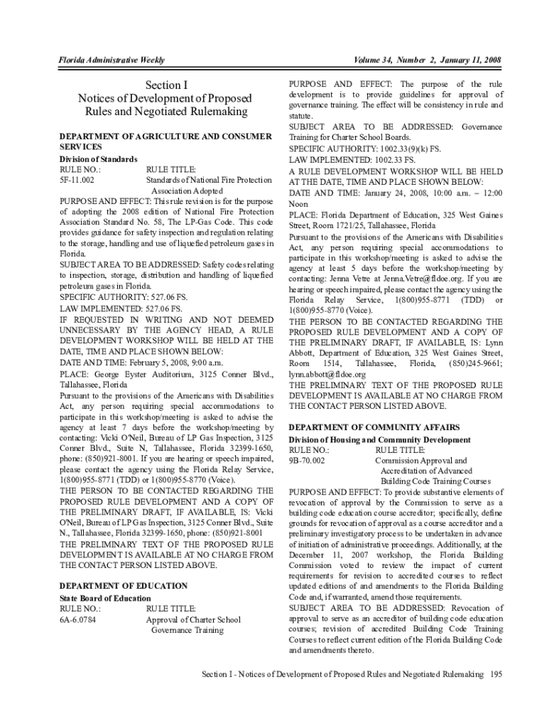 Florida Administrative WeeklyVolume 34, Number 2, January 11, 2008Section I Notice of Development of Proposed Rules and Negotiated Rule making DEPARTMENT OF AGRICULTURE AND CONSUMER SERVICES Division