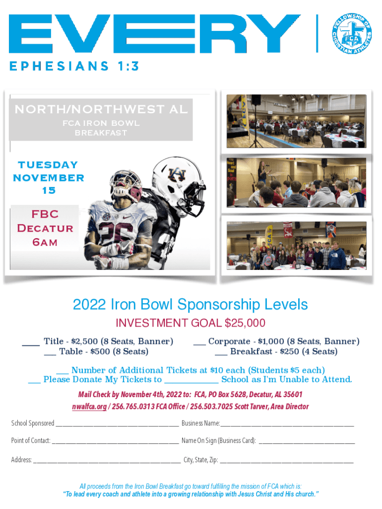 FCA IRON BOWL BREAKFASTTUESDAY NOVEMBER 15FBC Decatur 6am2022 Iron Bowl Sponsorship Level INVESTMENT GOAL $25,000 __ Title $2,500 (8 Seats, Banner)___ Corporate $1,000 (8 Seats, Banner) ___ Breakfast