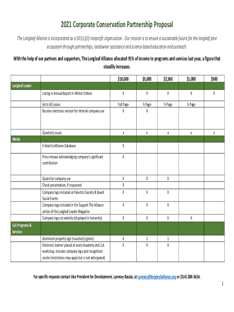 2021 Corporate Conservation Partnership Proposal The Long leaf Alliance is incorporated as a 501(c)(3) nonprofit organization. Our mission is to ensure a sustainable future for the long leaf pine