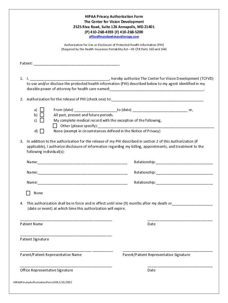 HIPAA Privacy Authorization Form The Center for Vision Development 2525 Rival Road, Suite 126 Annapolis, MD 21401 (P) 4102684393 (F) 4102685200 office@marylandvisiontherapy.comAuthorization for Use