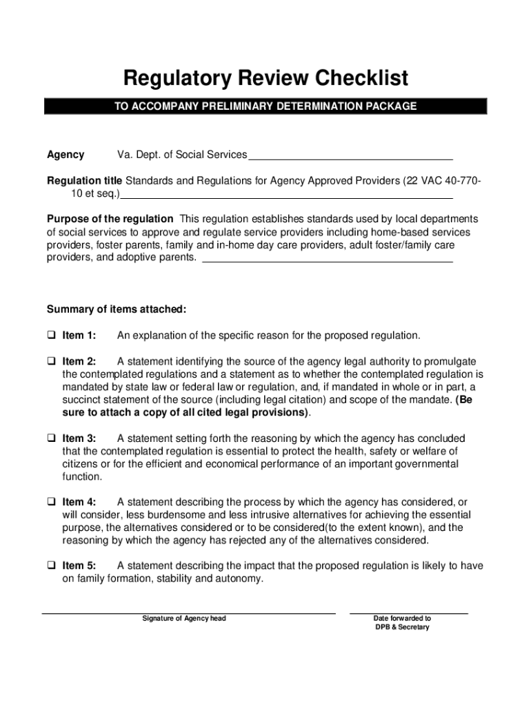 Regulatory Review Checklist TO ACCOMPANY PRELIMINARY DETERMINATION PACKAGEAgencyVa. Dept. of Social Services ___Regulation title Standards and Regulations for Agency Approved Providers (22 VAC 4077010