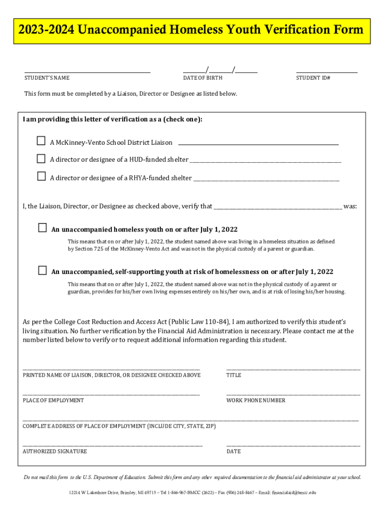 Get the free 2023-2024 Unaccompanied Homeless Youth Verification Form