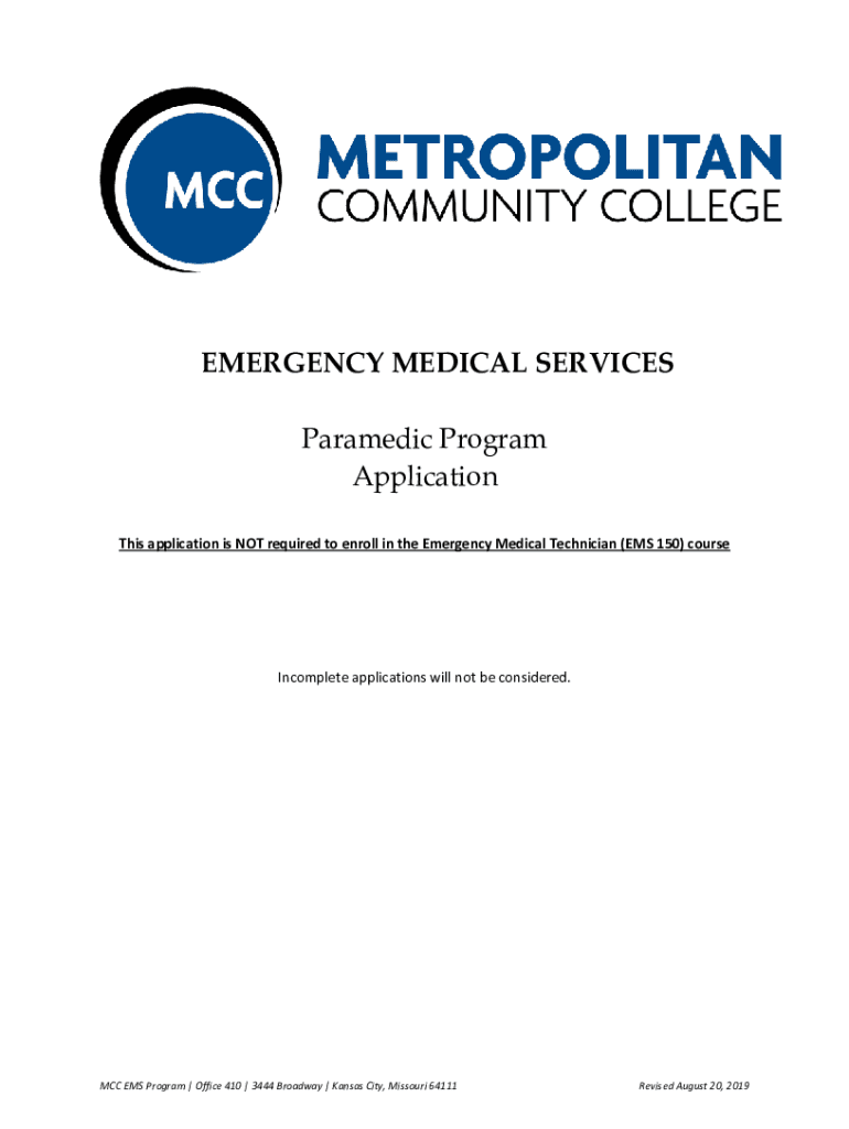 EMERGENCY MEDICAL SERVICES Paramedic Program Application This application is NOT required to enroll in the Emergency Medical Technician (EMS 150) courseIncomplete applications will not be considered.