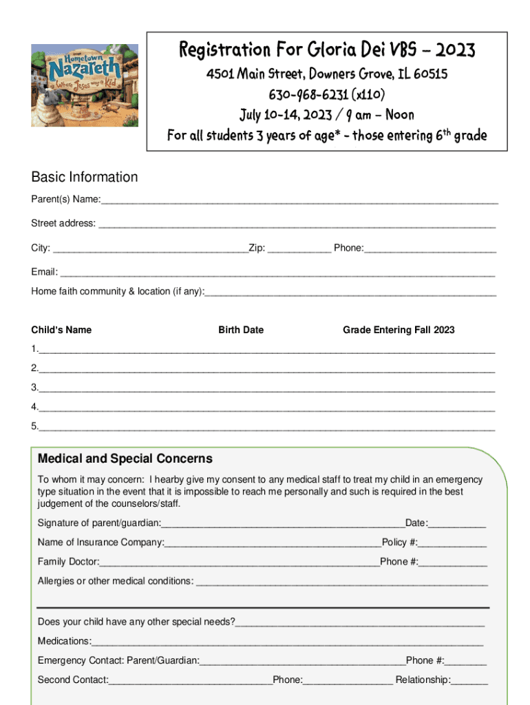 Registration For Gloria DEI VBS 2023 4501 Main Street, Downers Grove, IL 60515 6309686231 (x110) July 1014, 2023 / 9 am Noon For all students 3 years of age* those entering 6th grade *All participants