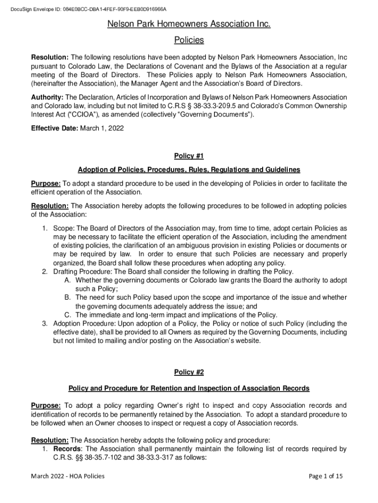 DocuSign Envelope ID: 084E0BCCDBA14FEF90F9EEB0D916966ANelson Park Homeowners Association Inc. Policies Resolution: The following resolutions have been adopted by Nelson Park Homeowners Association,
