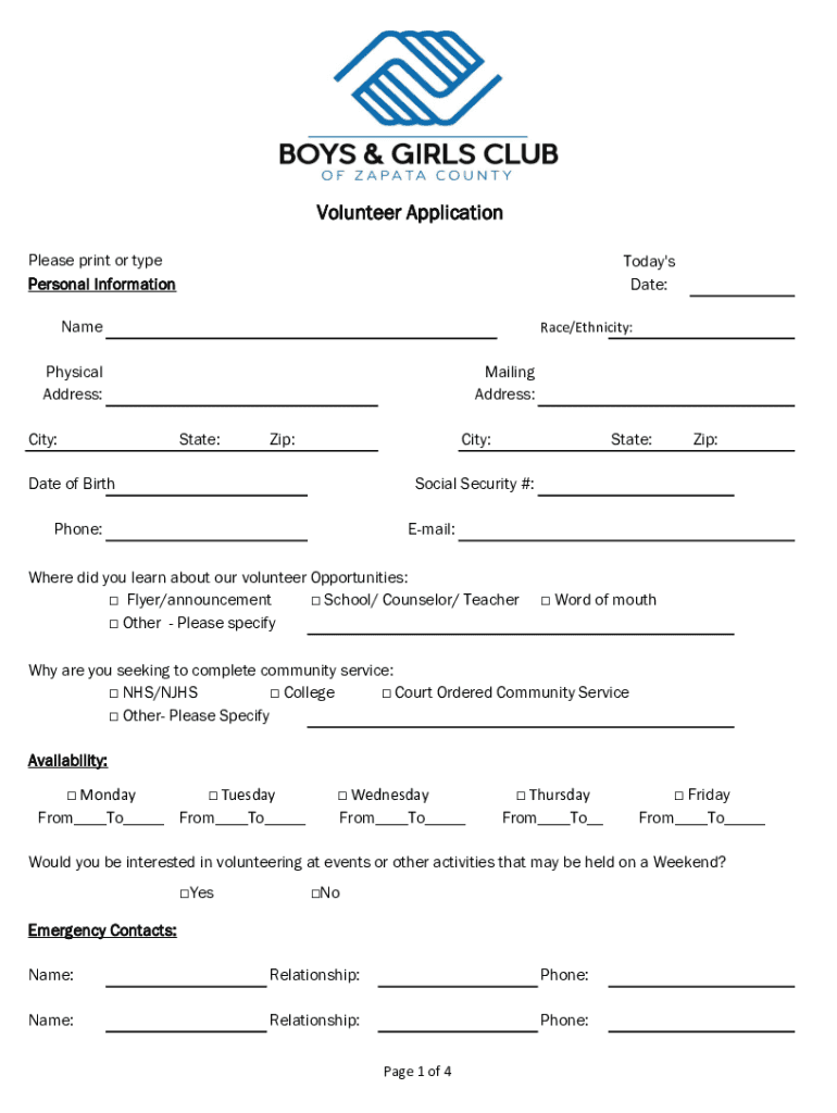 Volunteer Application Please print or type Personal InformationToday\'s Date:Namesake/Ethnicity:Physical Address: City:Mailing Address: State:Zip:City:Date of Birthrate:Zip:Social Security #:Phone:Email:Where