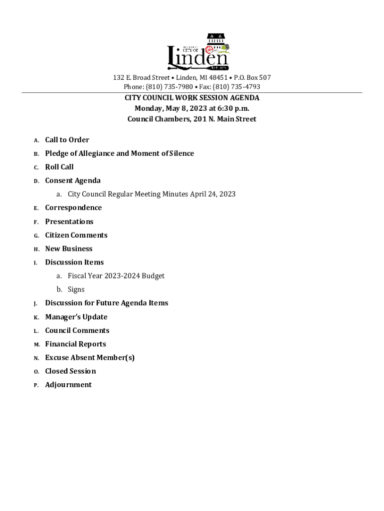 132 E. Broad Street Linden, MI 48451 P.O. Box 507 Phone: (810) 7357980 Fax: (810) 7354793CITY COUNCIL WORK SESSION AGENDA Monday, May 8, 2023, at 6:30 p.m. Council Chambers, 201 N. Main Street. Call