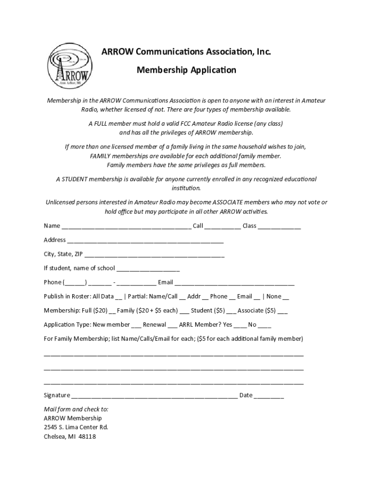 ARROW Communications Association, Inc. Membership Application Membership in the ARROW Communications Association is open to anyone with an interest in Amateur Radio, whether licensed of not. There