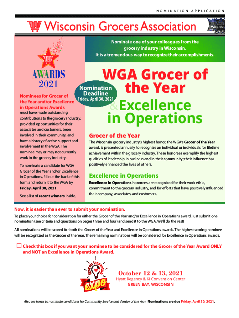 NOMINATION APPLICATIONNominate one of your colleagues from the grocery industry in Wisconsin. It is a tremendous way to recognize their accomplishments.WGA Grocer of Nomination the Year Deadline &