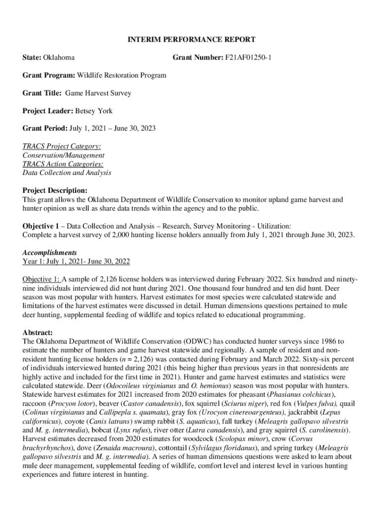 INTERIM PERFORMANCE REPORT State: Oklahoma Grant Number: F21AF012501Grant Program: Wildlife Restoration Program Grant Title: Game Harvest Survey Project Leader: Betray York Grant Period: July 1, 2021,