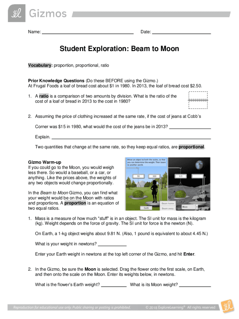 Name:Date:Student Exploration: Beam to Moon Vocabulary: proportion, proportional, ratioPrior Knowledge Questions (Do these BEFORE using the Gizmo.) At Frugal Foods a loaf of bread cost about $1 in