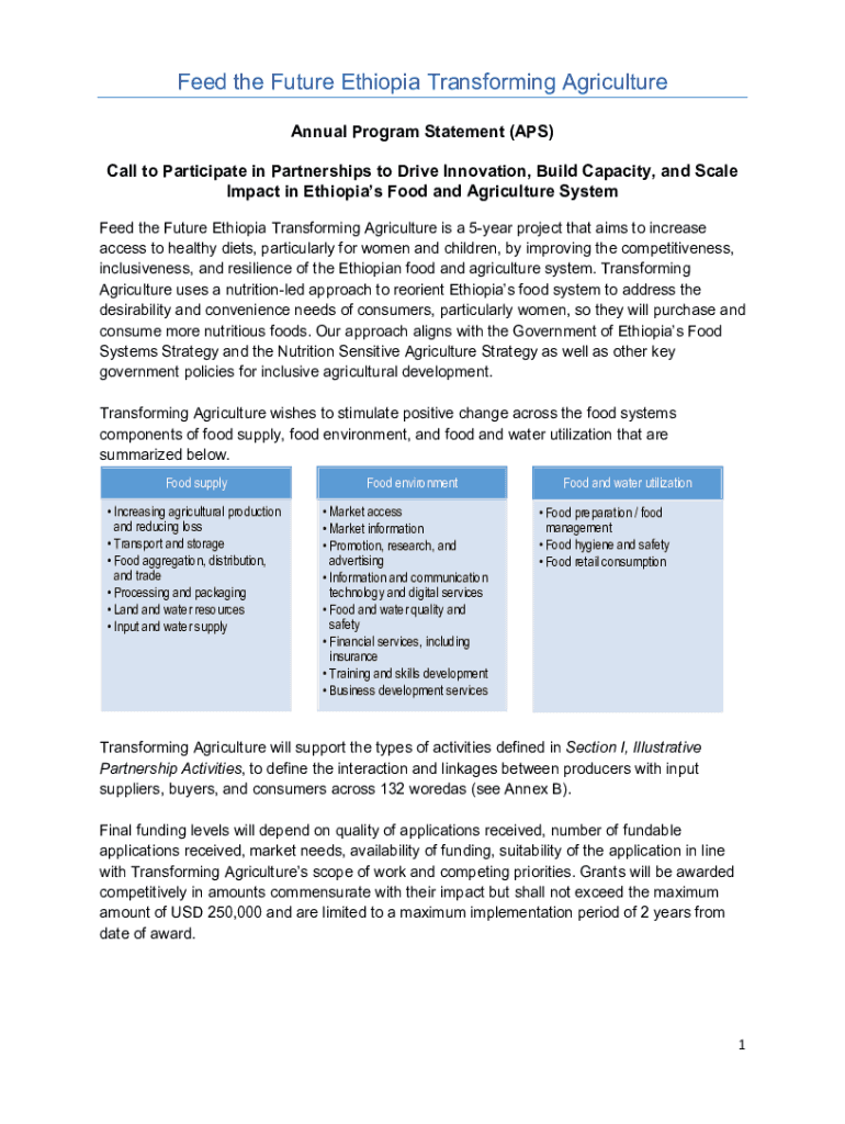 Feed the Future Ethiopia Transforming Agriculture Annual Program Statement (APS) Call to Participate in Partnerships to Drive Innovation, Build Capacity, and Scale Impact in Ethiopia's Food and Agriculture