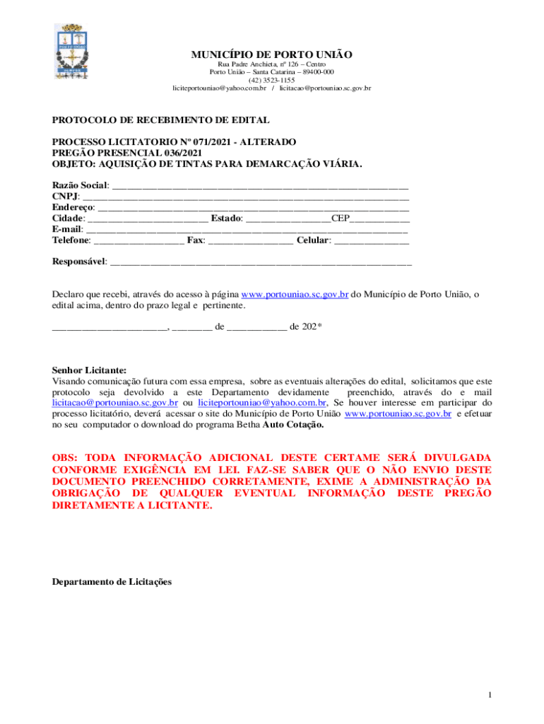 MUNICIPAL DE PORTO UNIT RUA Padre Ancient, n 126 CENTR Porto Unit Santa Catarina 89400000 (42) 35231155 liciteportouniao@yahoo.com.br / licitacao@portouniao.sc.gov.brPROTOCOLO DE RECEBIMENTO DE EDIT