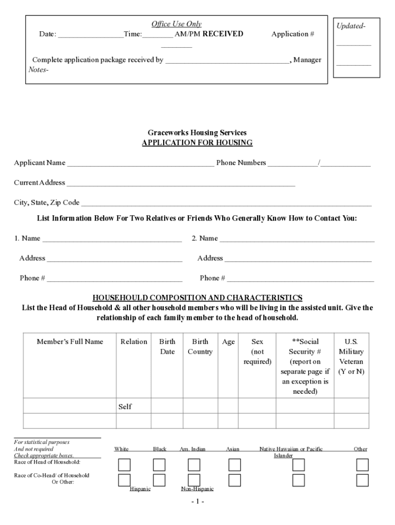 Office Use Only Date: ___Time:___ AM/PM RECEIVED ___Application #Complete application package received by ___, Manager NotesUpdated___ ___Grace works Housing Services APPLICATION FOR HOUSING Applicant