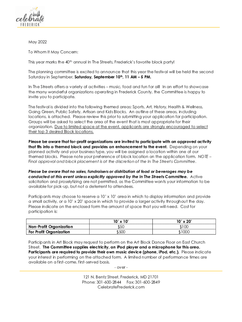 May 2022 To Whom It May Concern: This year marks the 40th annual In The Streets, Frederick's favorite block party! The planning committee is excited to announce that this year the festival will be