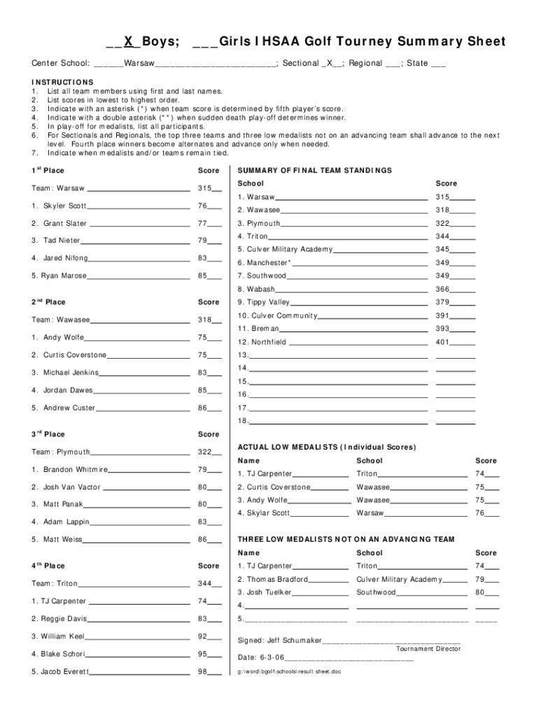 Get the free XBoys; Girls IHSAA Golf Tourney Summary Sheet